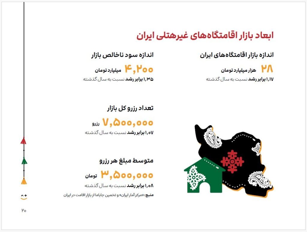 بر اساس این گزارش، ارزش بازار اقامتگاههای ایران در سال ۱۴۰۳ به حدود ۲۸ هزار میلیارد تومان رسیده است. رقمی که نهتنها بزرگی گردشگری داخلی را نشان میدهد، بلکه از پایداری تقاضا برای سفر در کشور حکایت دارد.